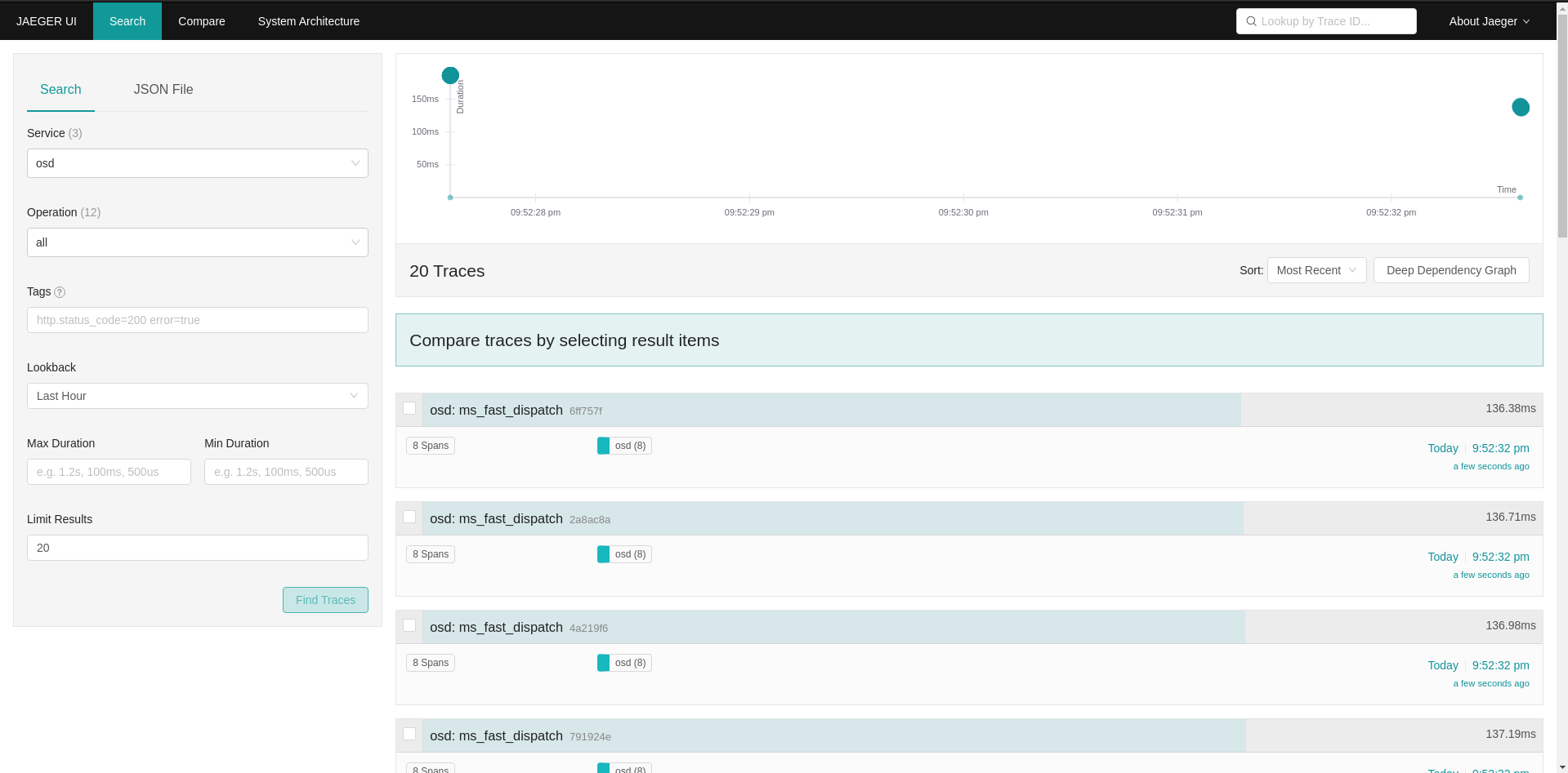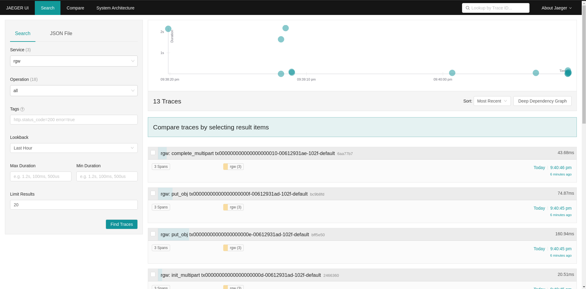 Traces run on RGW can be found under the Service rgw in the Jaeger Frontend.